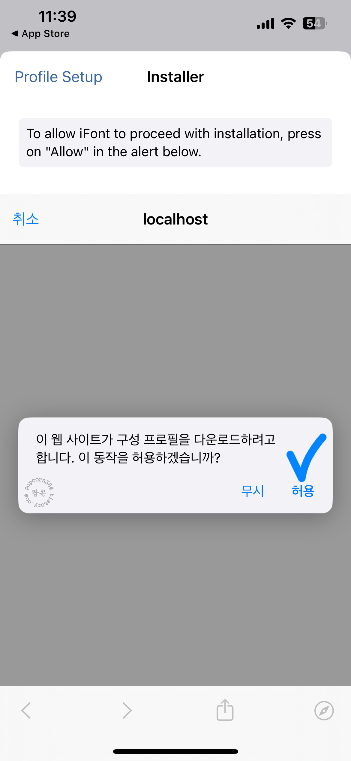 다시 'Imported' 메뉴로 와서 설치할 폰트 파일 이름을 확인 후에 'INSTALL'를 눌러줍니다. 그러면서 '이 웹 사티으가 구성 프로필을 다운로드 하려고 합니다. 이 동작을 허용하겠습니까?'라는 문구의 팝업창이 뜹니다. '허용'을 눌러주면 프로파일이 다운로드됨이라는 창이 한 번 뜨면 '닫기' 누릅니다.