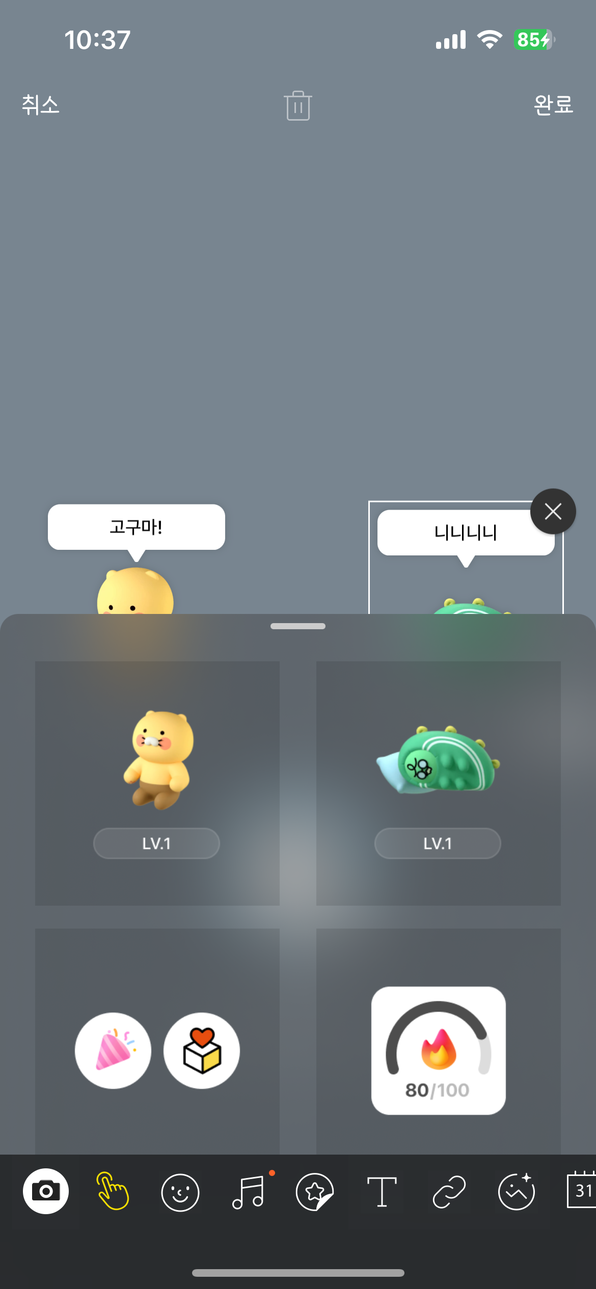 프로필 스티커에 카카오프렌즈 고양이 춘식이와 자취왕 죠르디가 생겼어요. 나만 누를 수 있고, 친구는 누를 수 없어요. 최고 레벨은 10까지 인데, 과연 레벨마다 어떤 모습을 보여줄 지 기대되서 한 번 해보려고요. 춘식이는 놀아주기/구경하기가 있고, 죠르디는 쉬기/집안일 하기가 있어요. 누를 때마다 일정 경험치가 쌓이면서 레벨업을 하는데 같은 버튼을 눌러도 애니메이션이 여러개가 있어서 보는 재미가 있더라고요. 한 번 차근차근 만들어볼까합니다.