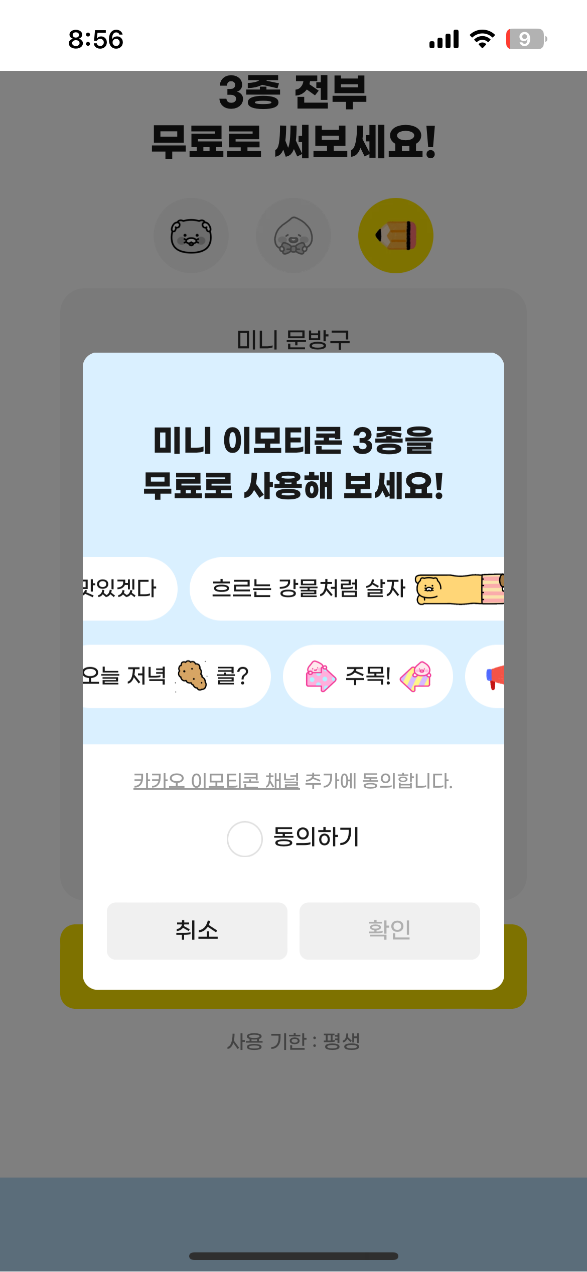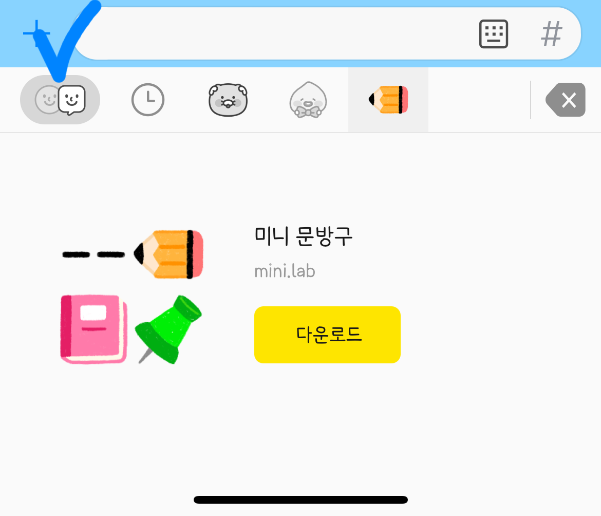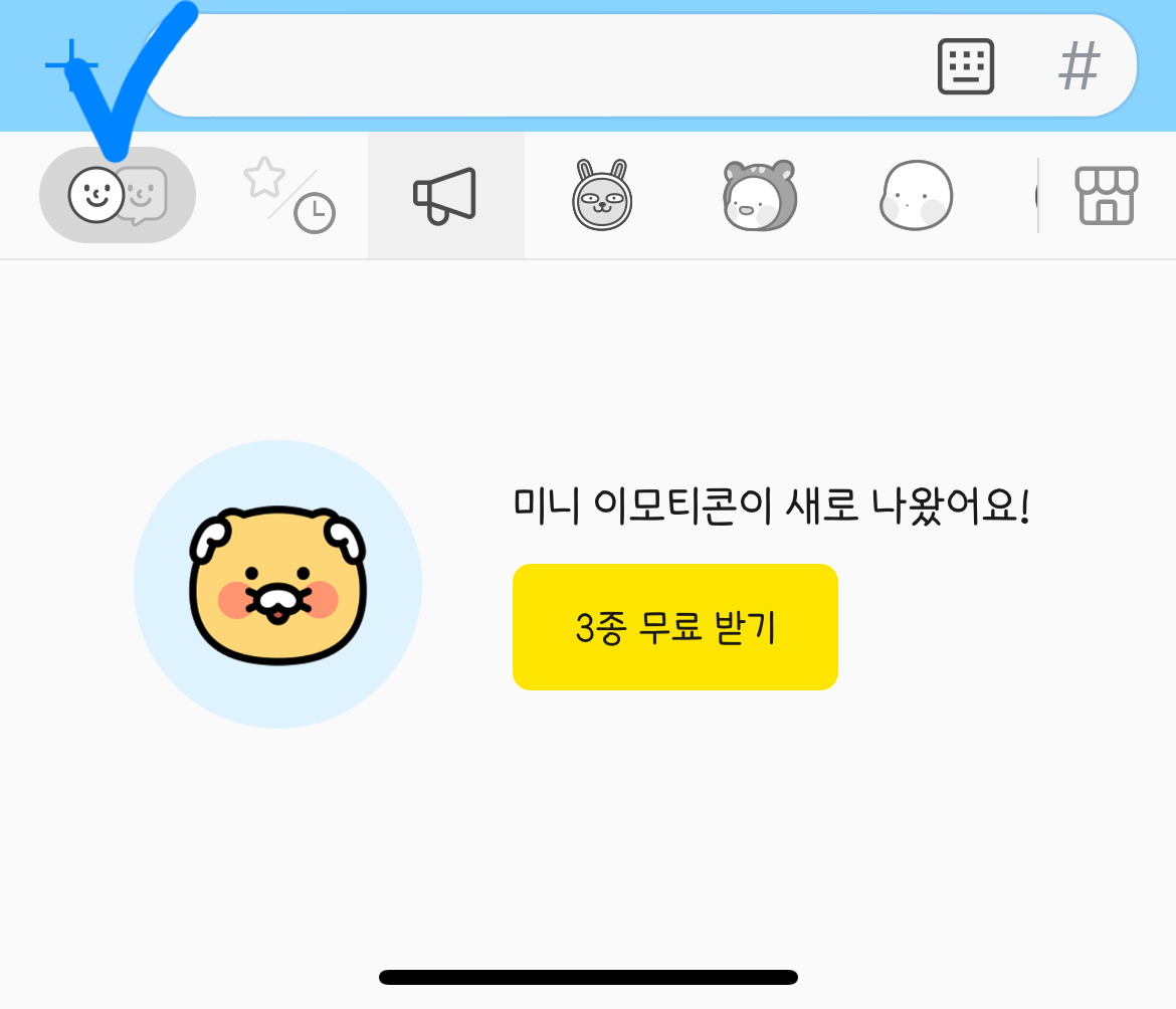 이걸 사용하기 위해서는 카카오 이모티콘 채털 추가에 동의해야지만 '미니 이모티콘 탭'이 생깁니다. 미니 이모티콘 탭이 새롭게 생기기 때문에 이 이모티콘만 모아서 볼 수 있어요.
