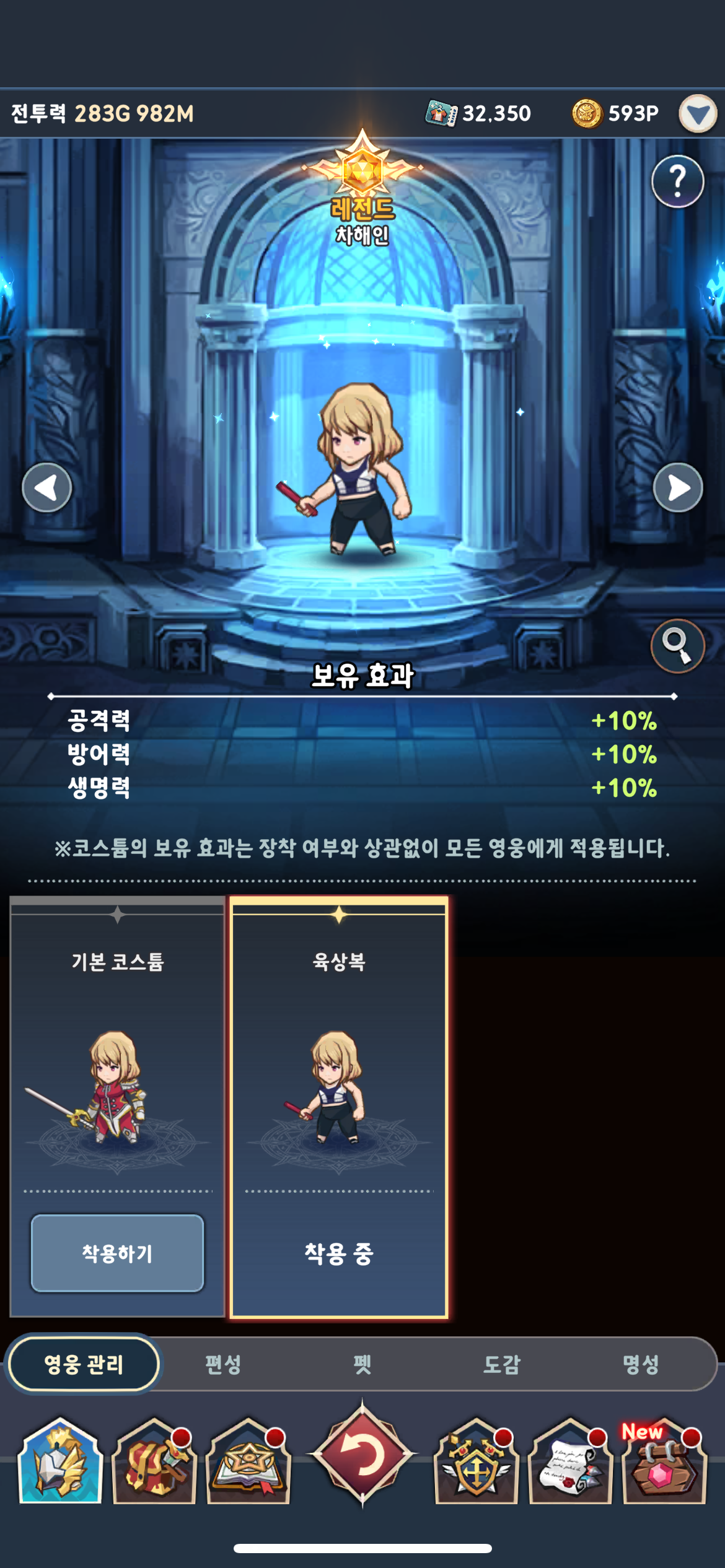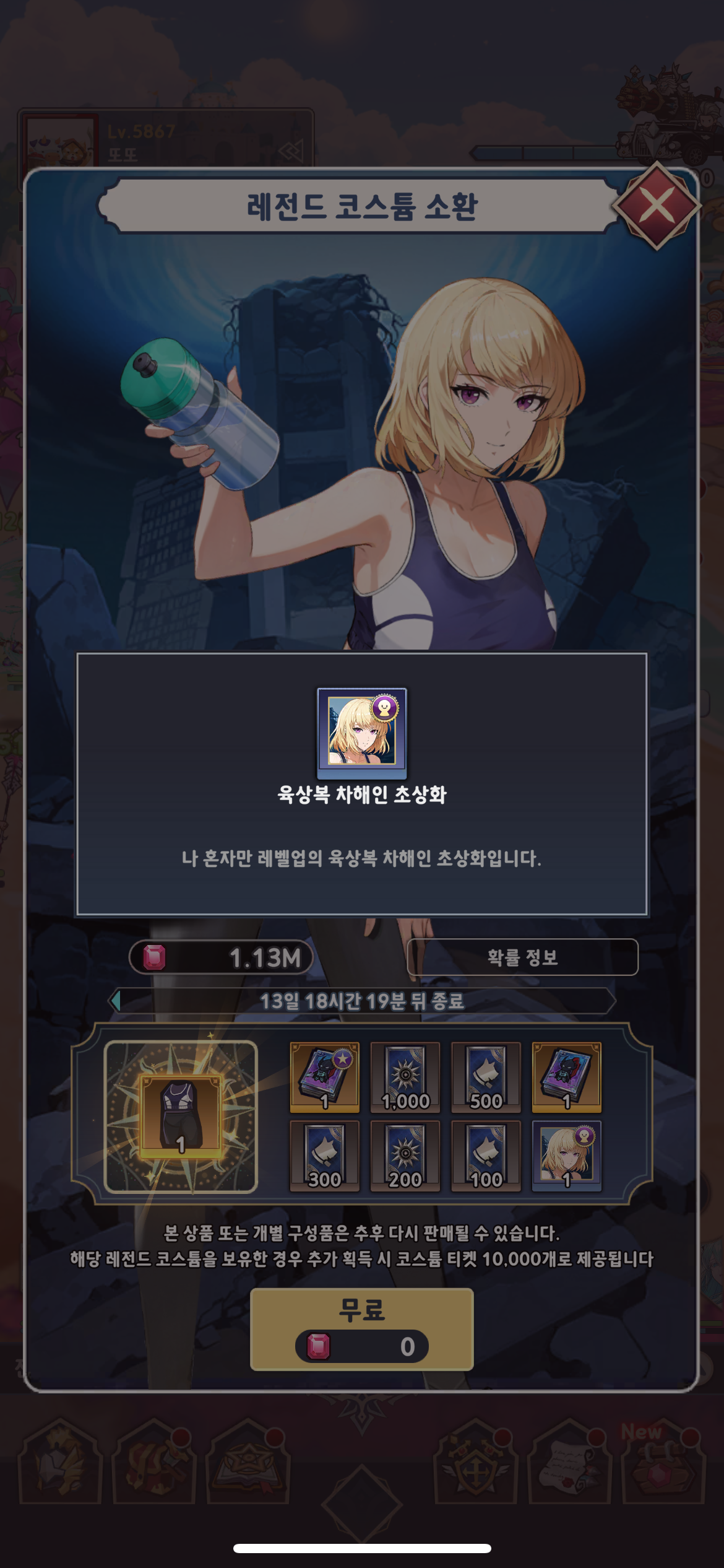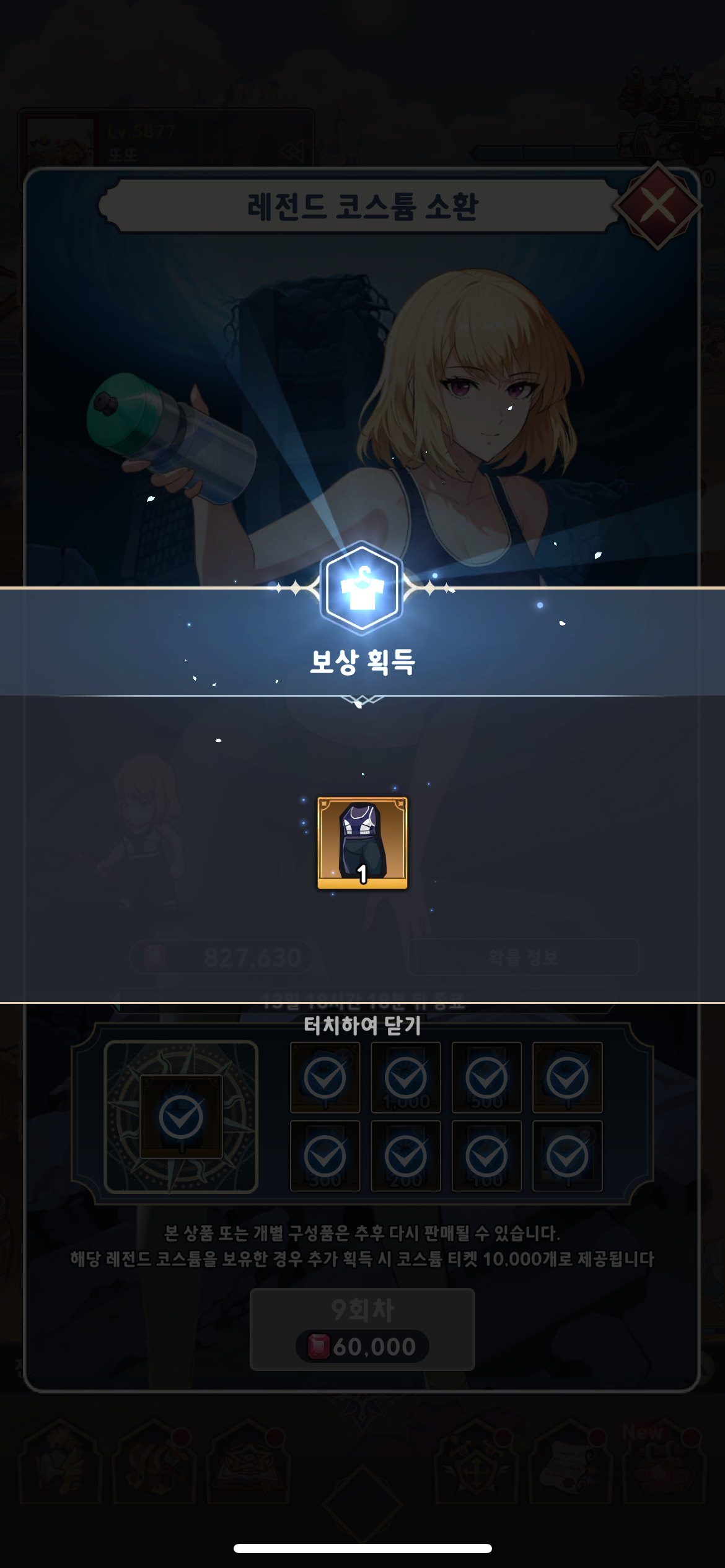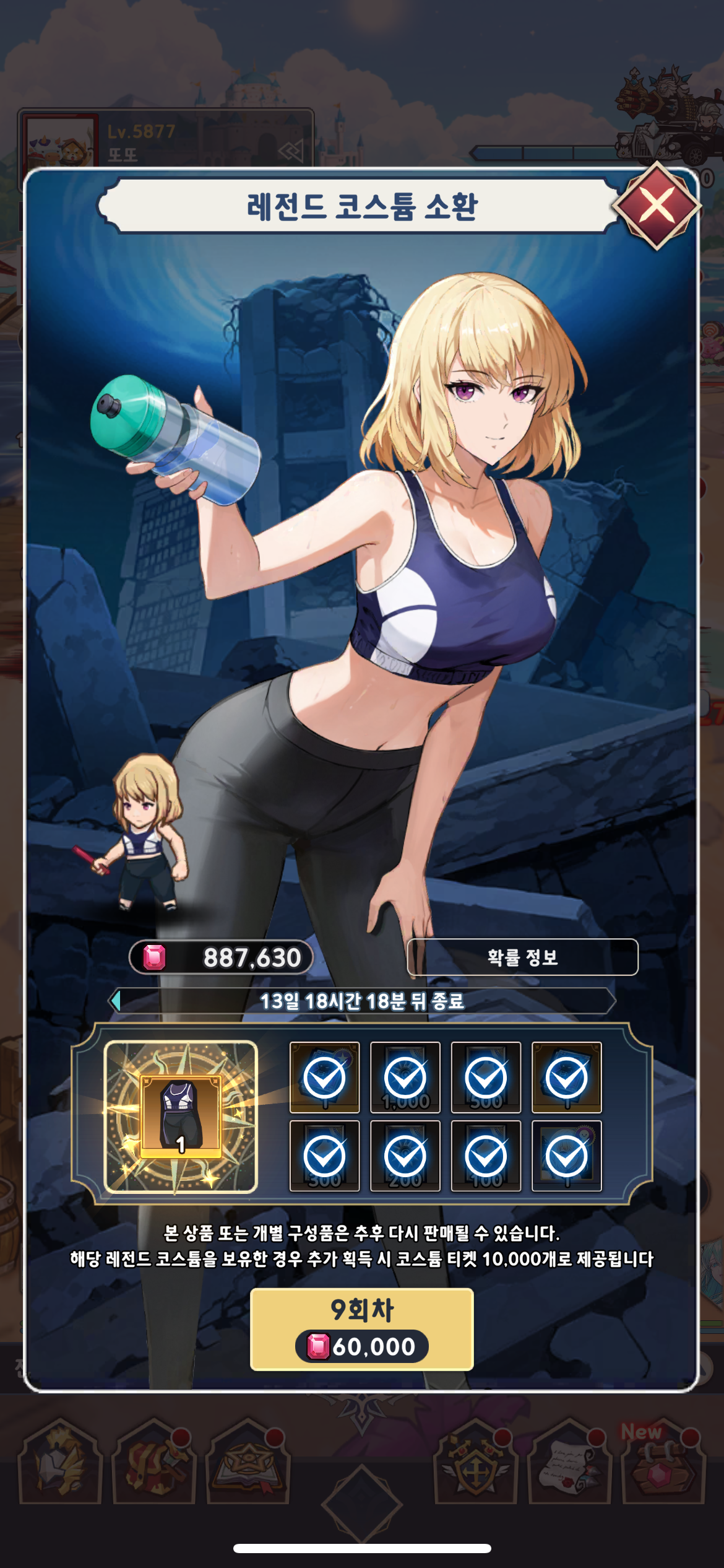 레전드 코스튬이 능력치 +10%이라서 무조건 가지고 있는 데 좋더라고요. 그래서 레전드 코스튬 나오면 무조건 뽑는 편입니다. 9회차까지 다 뽑으려면 31만 루비! 파이팅 하세요!