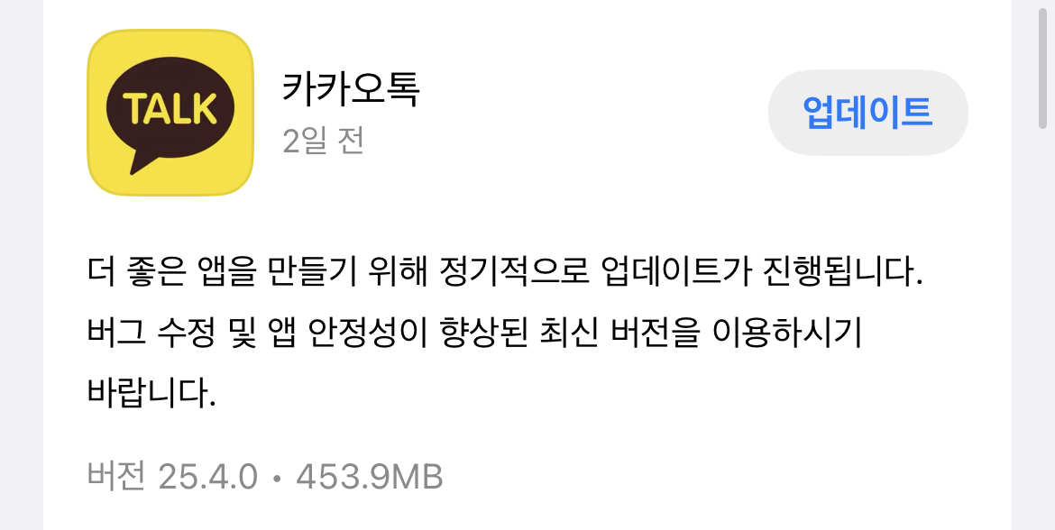 | 카카오톡 25.4.2버전, 정기적인 업데이트 [팝콘] (0) | 2025.09.17 |