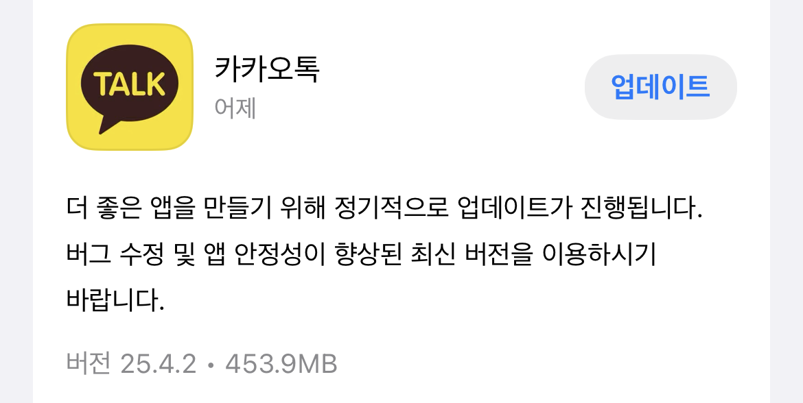 | 카카오톡 25.3.2버전, 정기적인 업데이트 [팝콘] (0) | 2025.04.30 |