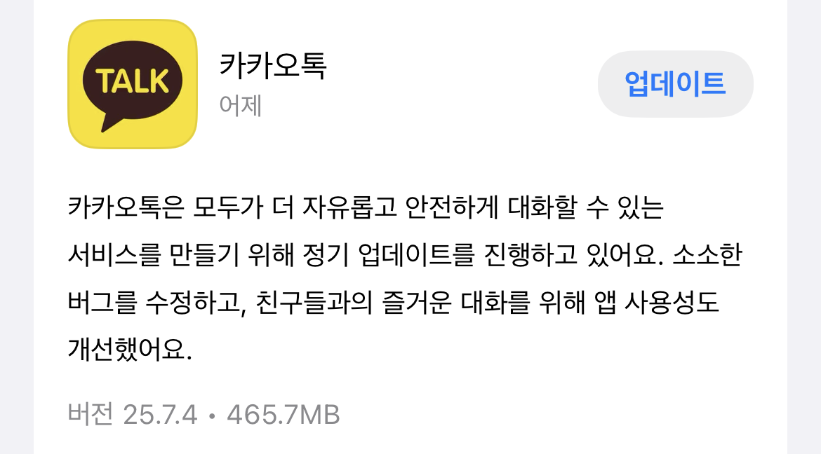 | 카카오톡 25.7.5버전, 정기적인 업데이트 [팝콘] (0) | 2025.10.02 |