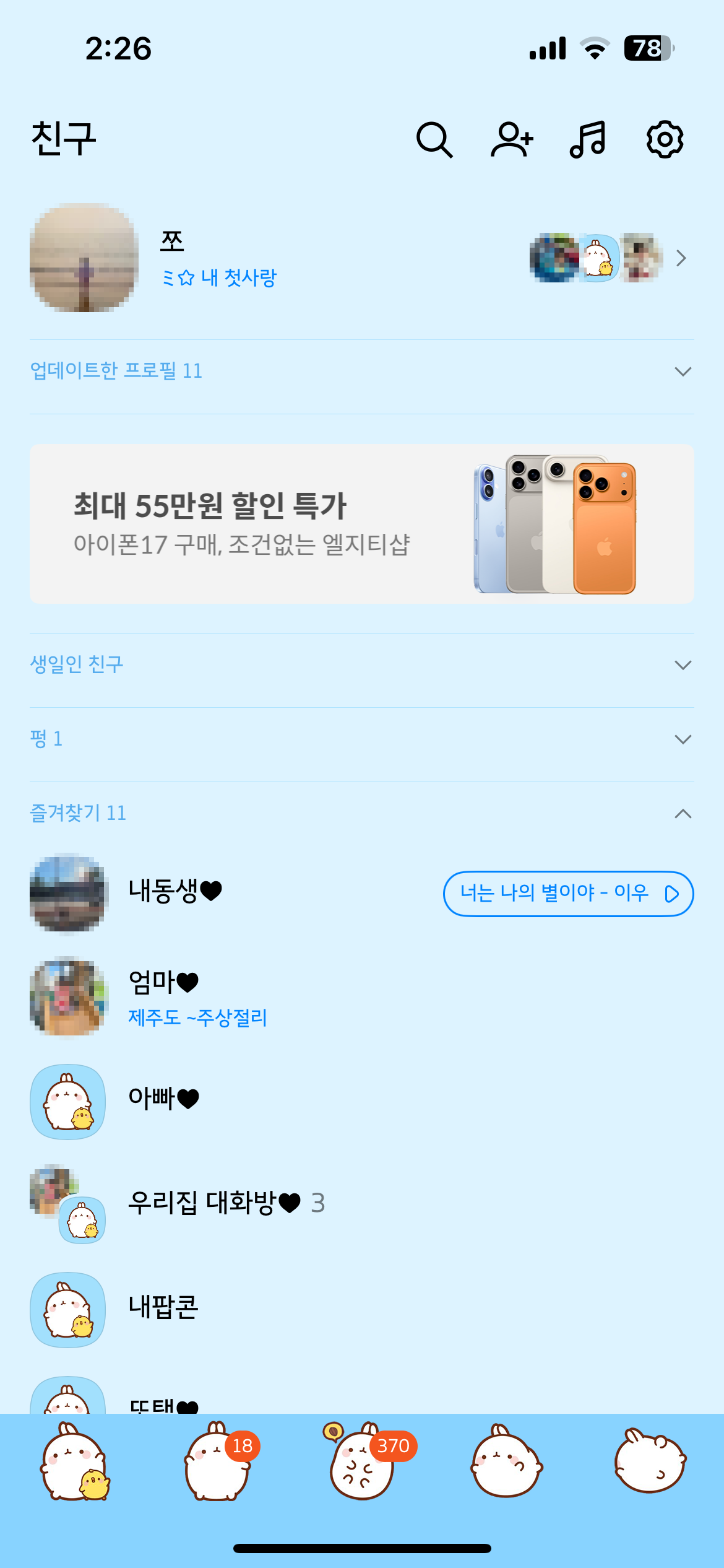 카카오톡 친구가 서로가 원해서 친구로 등록해놓은 경우가 100%인 경우가 없어요. 연락처 기반으로 했기에 서로 연락처만 있다면 친구등록하게 해놓고서.. 이건 아닌 것 같아요. 친구정리를 다 하라는 건가요? 그리고 피드도.. 이 사진 찍을 당시에 뜬 사진이 글을 쓰는 지금도 뜹니다. 10일이 지났는데 왜 계속 뜨는 건지 모르겠어요. 목록이 계속 고정되는 것도 아니고 계속 새로고침되면서 왔다갔다하는 것도 별로입니다.