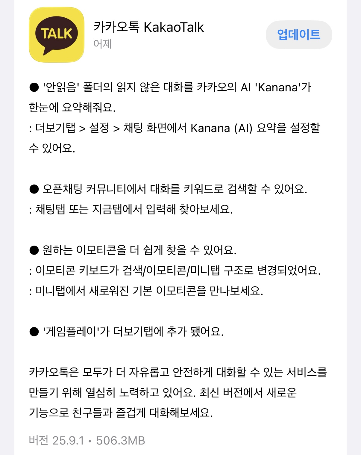 카톡 25.9.1버전 업데이트가 나왔어요.