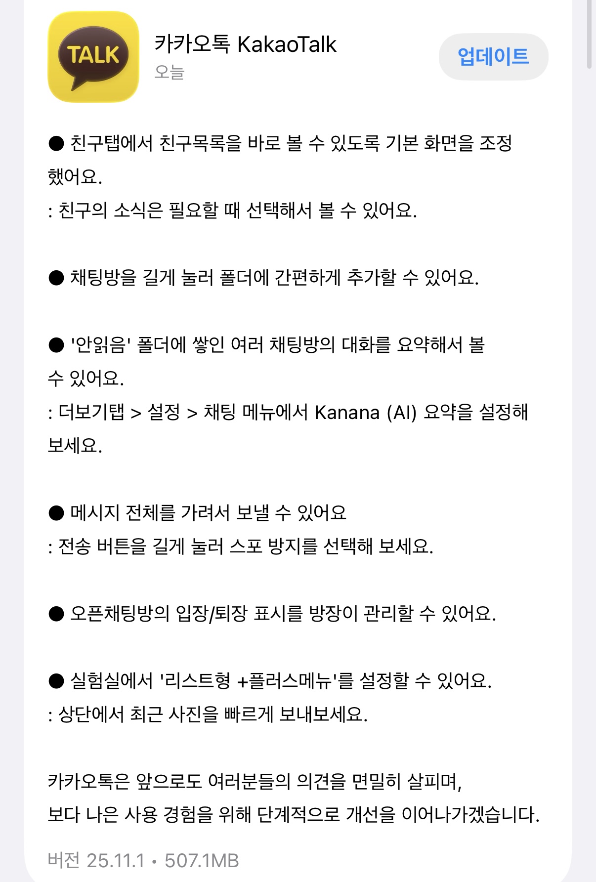 카톡 25.11.1버전 업데이트가 나왔어요.