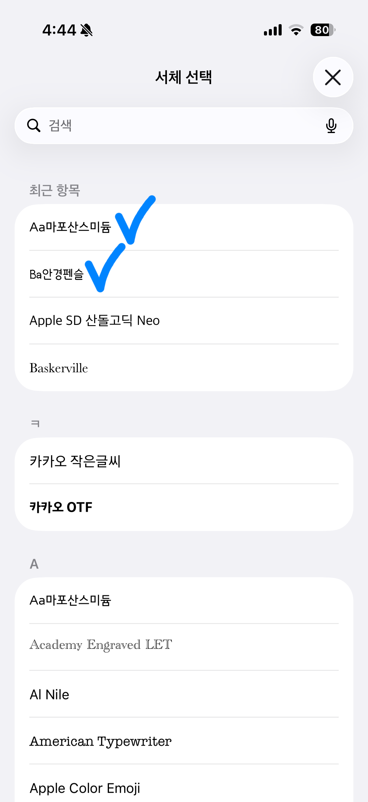 카카오톡에서 사용하려는 폰트 설치는 이렇게 마무리가 됩니다. 작고 깔끔한 글씨체를 원해서 찾아보니, 처음에는 합정산스가 정말 마음에 들더라고요. 그러다가 마포산스를 알게 되었는 데, 지금은 마포산스로 잘 사용하고 있어요. 나눔고딕도 정말 좋아하는 데 제 기준에서 카카오톡내에서 사용하긴 큰 편이더라고요. 그래서 블로그나 문서작업할 때 잘 사용하고 있어요. 그리고 아기자기해서 좋아한 글씨체인 Ba안경펜슬 글씨체도 구매해서 다 설치했어요. 폰트 구매처인 Aa폰트님의 네이버블로그 링크도 아래에 첨부합니다. 폰트가 없어진 이후에 아쉬움이 가득했는데, 이렇게 구매할 수 있는 곳이 있고 적용할 수 있는 방법이 있어서 구매하고 적용해서 사용하면서 마음편하게 사용하고 있어요. 아이폰의 경우는 이렇게 설치해야 하고 안드로이드의 경우에는 폰트를 폰에서 구매해서 사용가능한 것 같더라고요. 아이폰 유저분들께는 도움이 되었길 바랍니다.