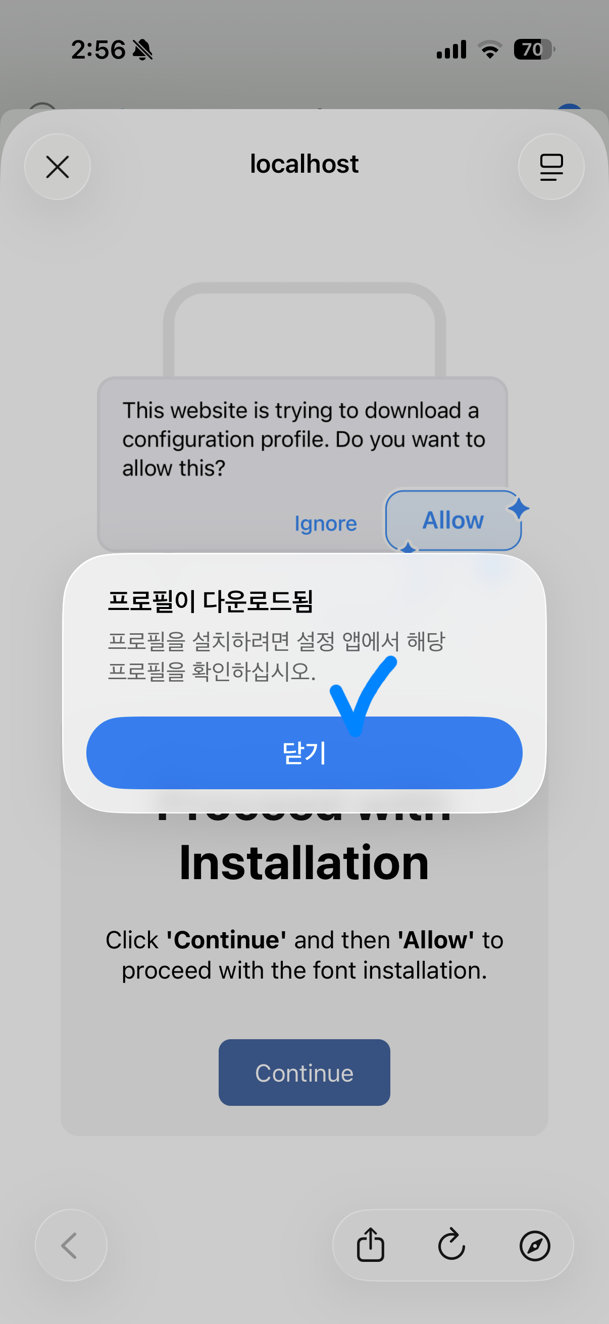이후 localhost를 허용합니다. 허용하면 프로필이 다운되었다고 하고 닫기가 뜹니다. 이후 Font Installation Guide가 뜹니다. 가이드 이미지로도 볼 수 있어요. Open Settings를 누르면 설정앱이 실행됩니다.