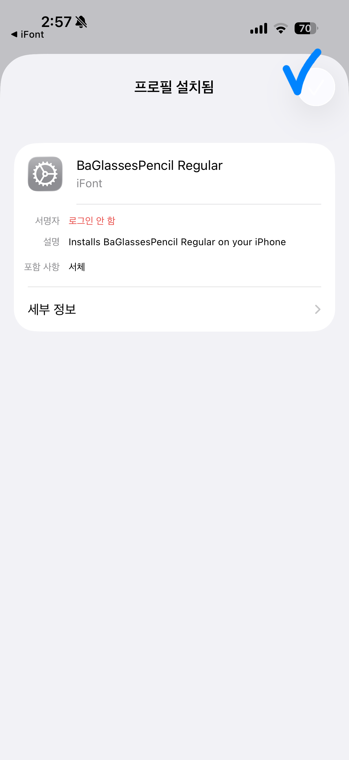 이러면 앱에서 할 수 있는 설치는 모두 끝났어요. 폰에 설치가 진행되었고, 이 폰트를 사용할 수 있도록 폰 내 설정에서 허용을 해줘야 합니다. 이후에 아래 2번째 하위메뉴의 내용이 바로 이어져서 열립니다.