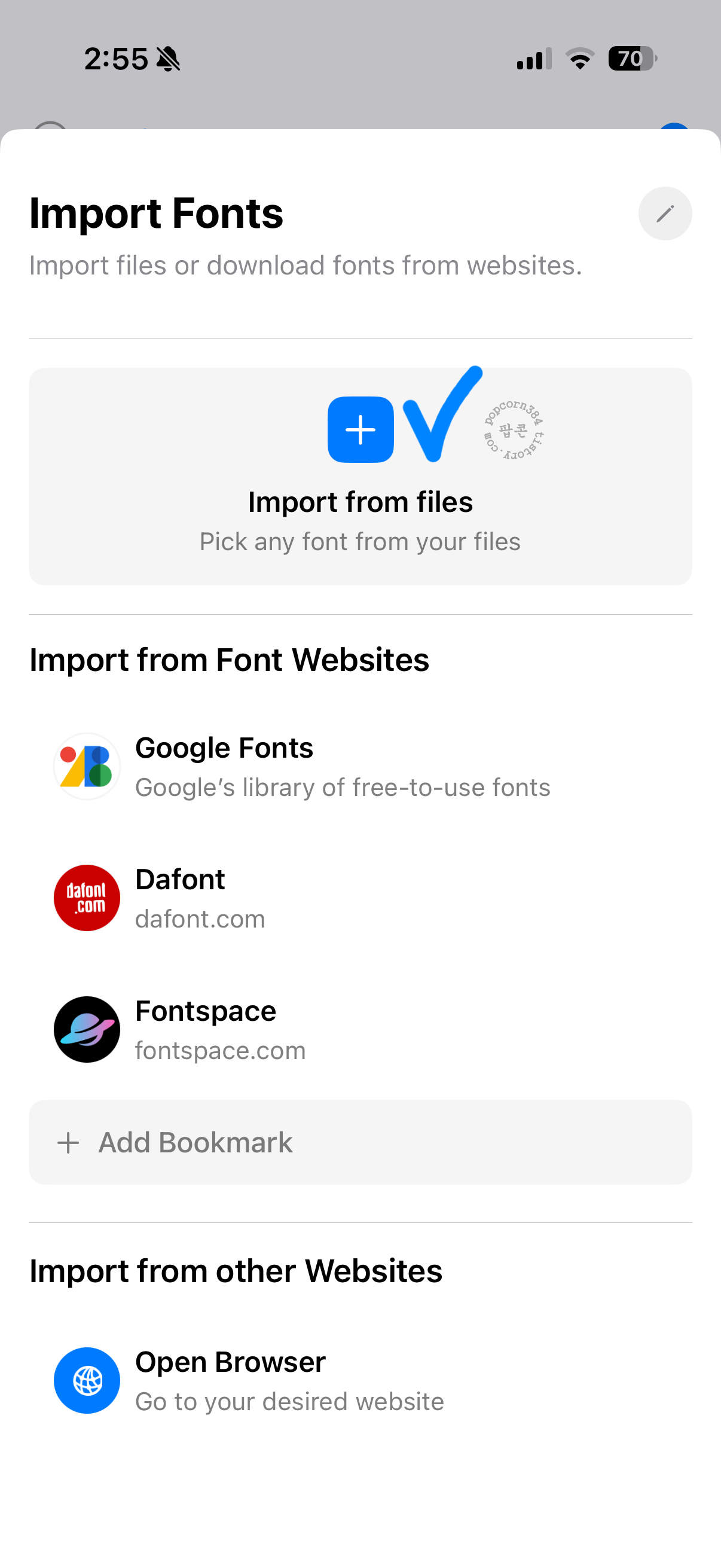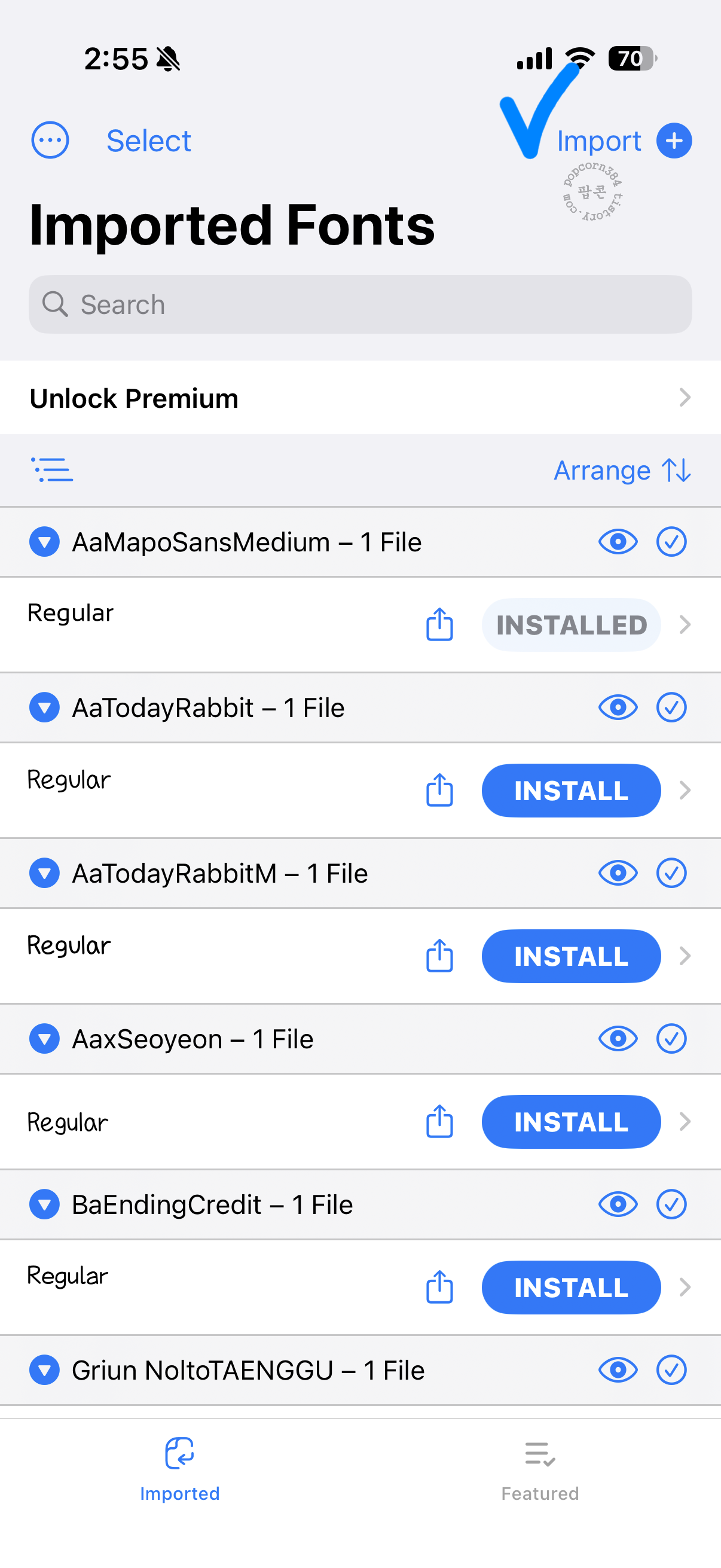어플 설치부터 진행됩니다. 앱스토어에서 어플을 다운로드 받으면, 무료로 이용 가능합니다. 설치 과정에서는 고맙게도 premium 이용없이 사용 가능합니다. 이 앱을 통해서 폰트 설치를 할 수 있도록 진행시켜줍니다. imported Fonts 화면 오른쪽 상단에 Import +를 누릅니다. import Fonts 화면에서 'Import from files' 이 보여요. 그부분을 눌러서 설치할 .ttf파일을 불러와야 합니다.
