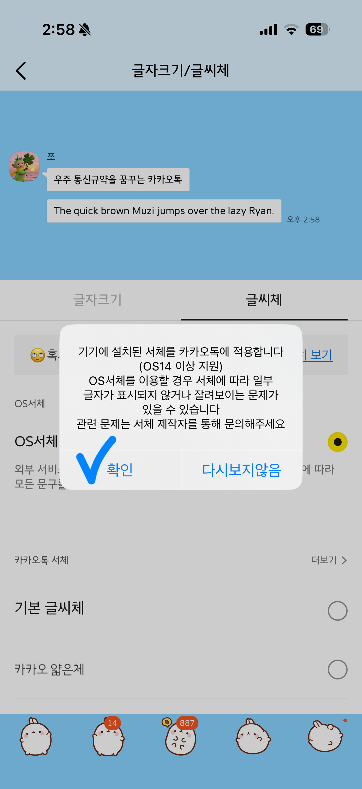 • 카톡(10.5.2), 내가 사용하고 싶은 글씨체 .ttf 파일 설치 후 OS서체로 설정하는 방법(Aa합정산스&Ba안경펜슬 구매) [팝콘]
