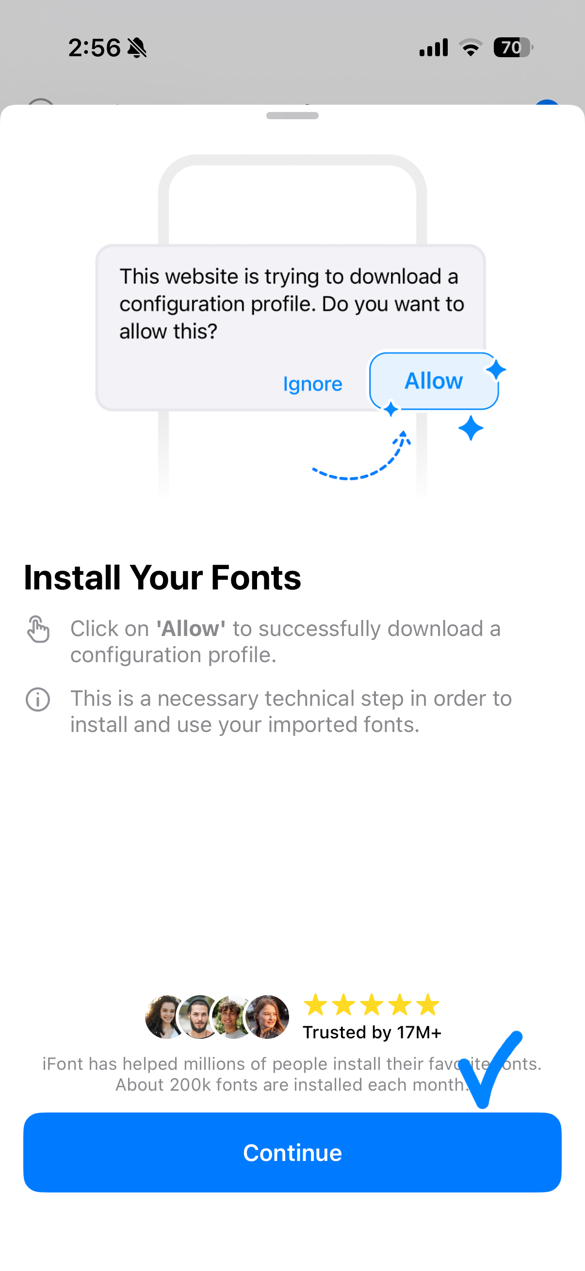Import from files를 누르면 최근 다운로드 화면이 뜨더라고요. 파일 앱로 연결되더라고요. 설치하기 위한 폰트 확장자는 .ttf입니다. 설치할 파일을 선택한 후 열기를 누르면 'Imported'에 불러온 파일이 보일거예요. 설치 가능한 폰트는 INSTALL이 떠있고, 설치된 폰트는 INSTALLED로 표시되어 있어요. 설치할 폰트의 INSTALL를 누르면 설치하는 과정이 넘어갑니다. Continue를 눌러줍니다.